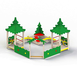 Комплекс включает в себя 4 несущих столба, бортики, 2 сиденья, 2 ограждения с волнообразной верхней стороной, 2 столешницы с закругленными углами. Элементы выполнены из влагостойких материалов, покрыты гипоаллергенной порошковой краской.