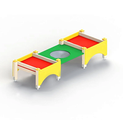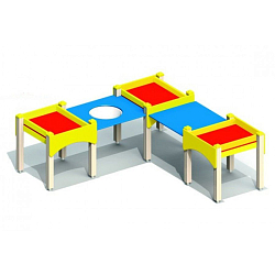 Конструкция имеет стилизованное оформление. Угловые стенки сходятся, образуя нос кораблика. В боковых панелях предусматриваются сквозные окошки-иллюминаторы и пространство для входа. Сиденья располагаются по периметру комплекса. На закругленных поверхностях дети отдыхают или выкладывают песочные фигуры.