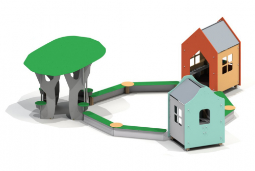 В стенах каждого домика вырезаны окна и вход. Имитация дерева состоит из фигурного ствола с ветвями, яркой кроны-наклонной односкатной крыши. Круглые элементы на углах песочницы могут служить столиками.