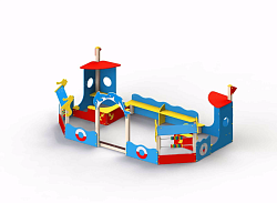 К горке со стальным нержавеющим скатом ведет лестница, оборудованная перилами и нескользящими ступенями. Стартовый участок дополняется металлической перекладиной. Песочница составляется из бортиков, угловых сидений, фигурных панелей с декором.