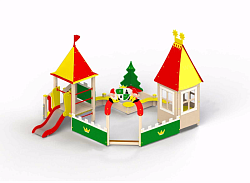 Огороженная площадка включает в себя: боковые панели, порог, арку, 2 башни с крышами и счетами, перекладины, скамейку, декоративные элементы.
