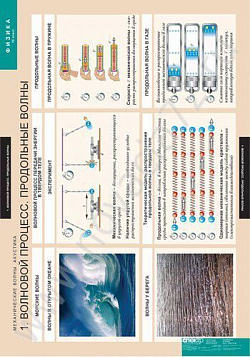 На плакате для изучения физики приведена шкала с длинами и частотами электромагнитных волн. Отметки сопровождаются цветными пояснительным изображениями (примеры источников).
