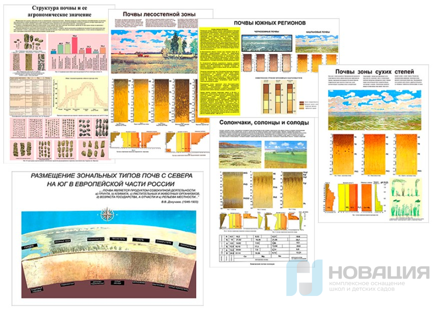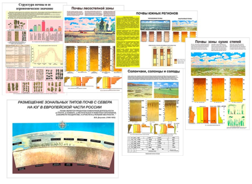 Плакаты используются для ознакомления с различными типами почв, их структурой, свойствами и особенностями в разных климатических зонах.