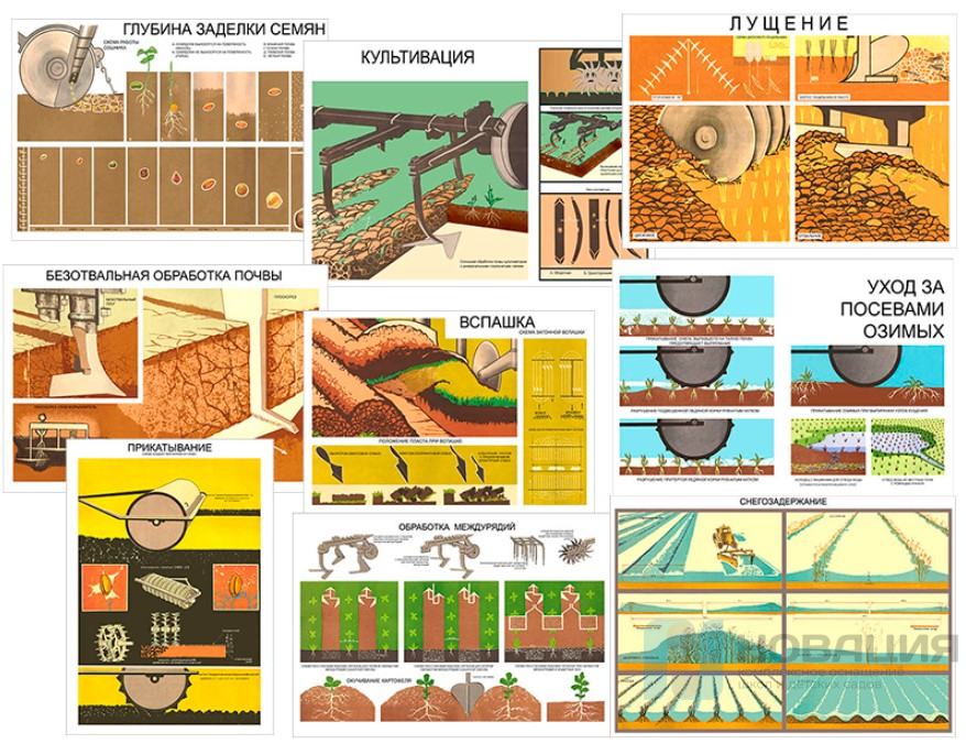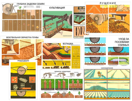 Плакаты используются для обучения и инструктажа агрономов и фермеров по вопросам обработки почвы, посева и ухода за культурами.