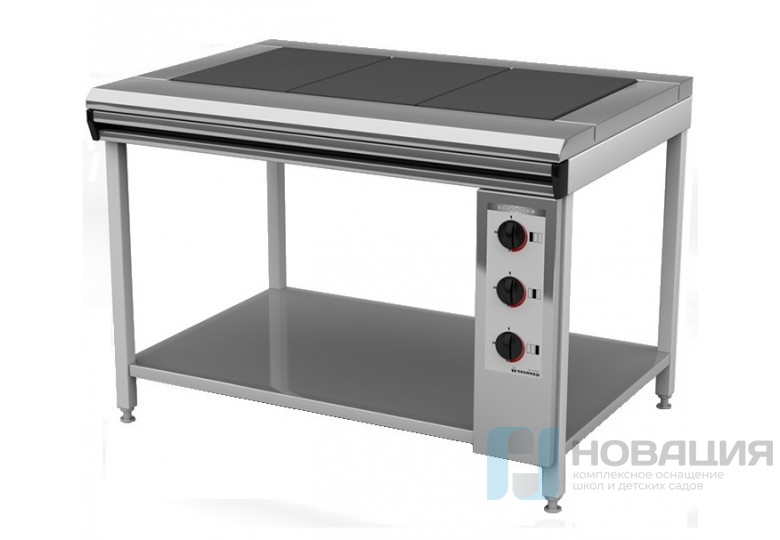 Плита на подставке с полкой имеет чугунные цельнолитые конфорки, которые обеспечивают быстрый и равномерный нагрев. Время разогрева до рабочей температуры (400°С) 30 мин. Рабочий стол плиты и лицевые панели из нержавеющей стали.