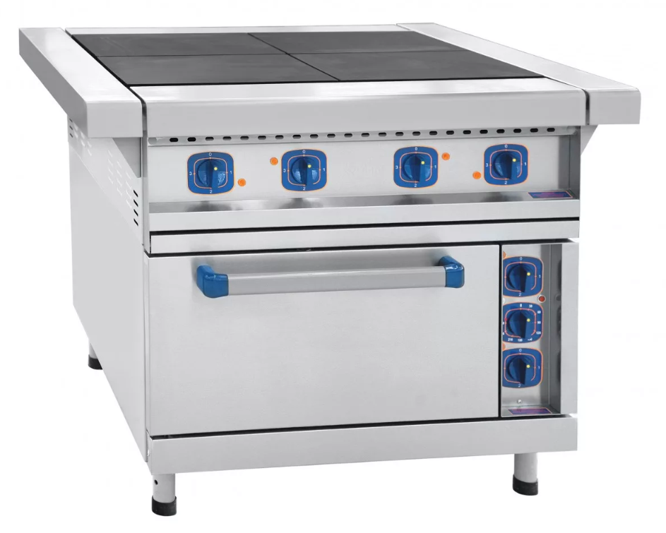 Плоские чугунные конфорки и жарочный шкаф разогреваются до максимальной температуры за 30 минут. Плита оснащена переключателями с плавной регулировкой мощности. Духовка имеет направляющие для противней размером 530х470х30 мм, а также раздельную регулировку мощности верхних и нижних ТЭНов. Встроенный терморегулятор предохраняет духовку от перегрева.