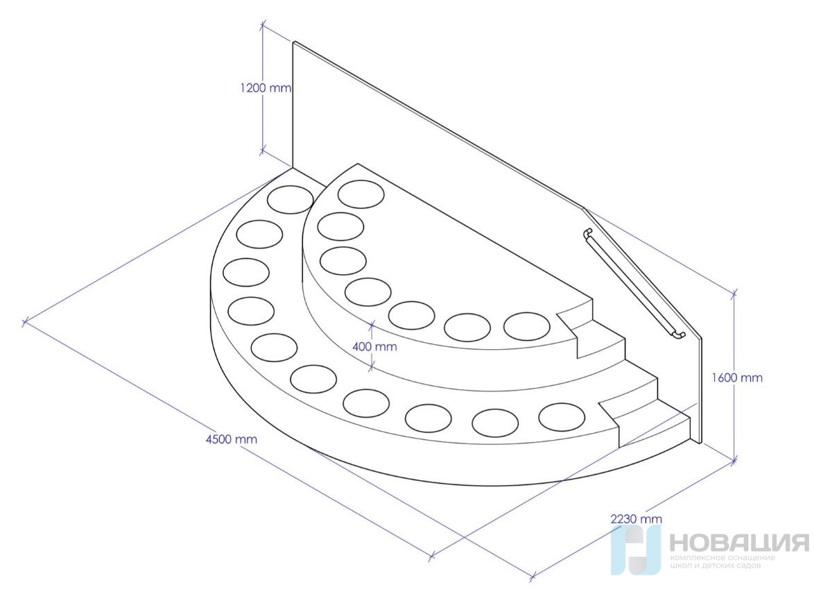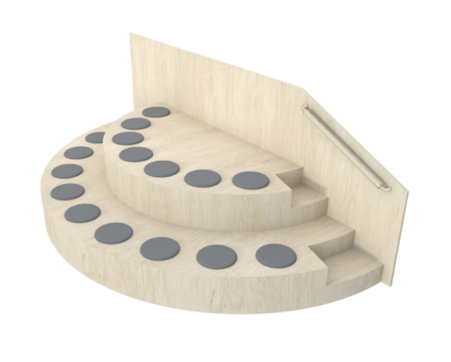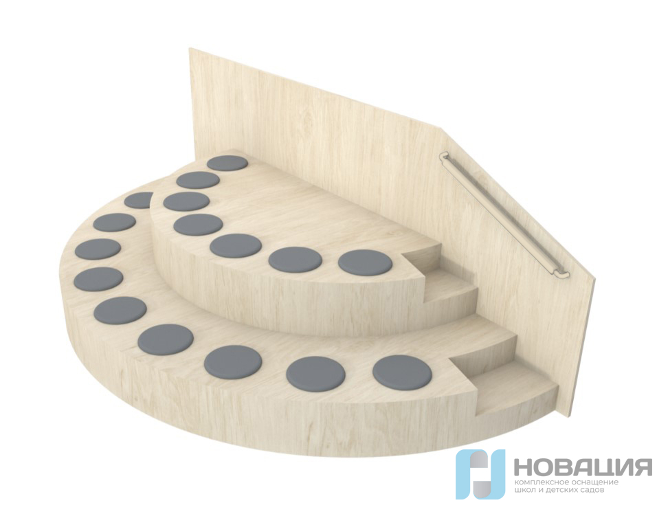 Подиум оснащен 17 круглыми подушками, которые не крепятся к сиденью. На второй ярус ведут ступени. В верхней части располагается поручень.