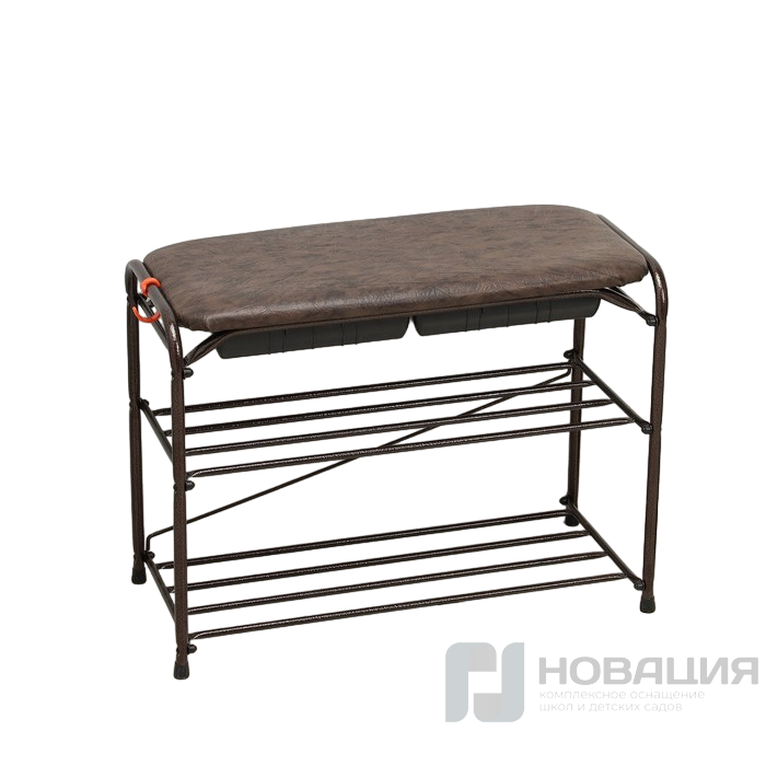 Подставка для обуви с упругим сиденьем выдерживает нагрузку до 120 кг. Обувница для школьного гардероба оснащается полками из металлических труб. Расстояние между ярусами составляет 140 и 215 мм.