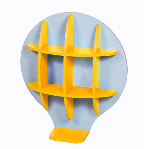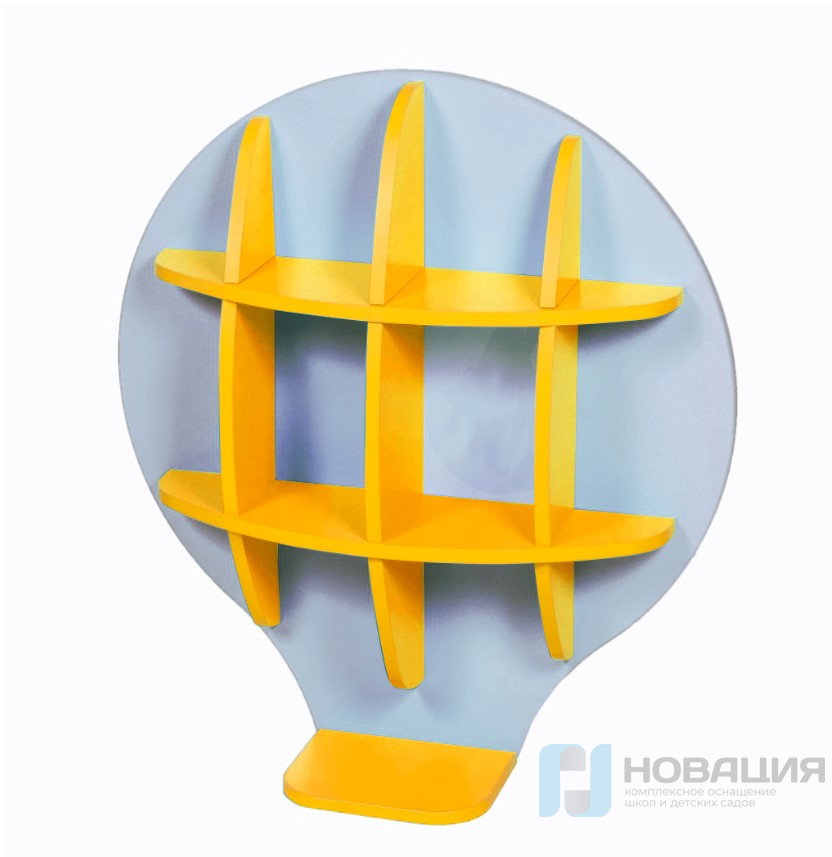На детской полке хранятся игрушки, поделки и пособия. Панель в форме воздушного шара закрепляется на стене. Полуоткрытые секции и горизонтальная поверхность внизу вмещают небольшие предметы.