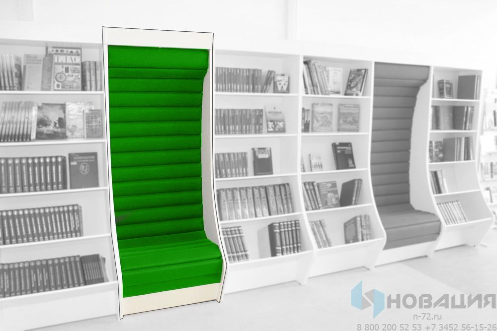 Посадочное место дополняет стеллаж для книг в современном информационно-библиотечном центре. Сиденье плавно переходит в спинку с наклонной верхней частью. Несколько стеллажей и посадочных мест формируют единый комплекс.