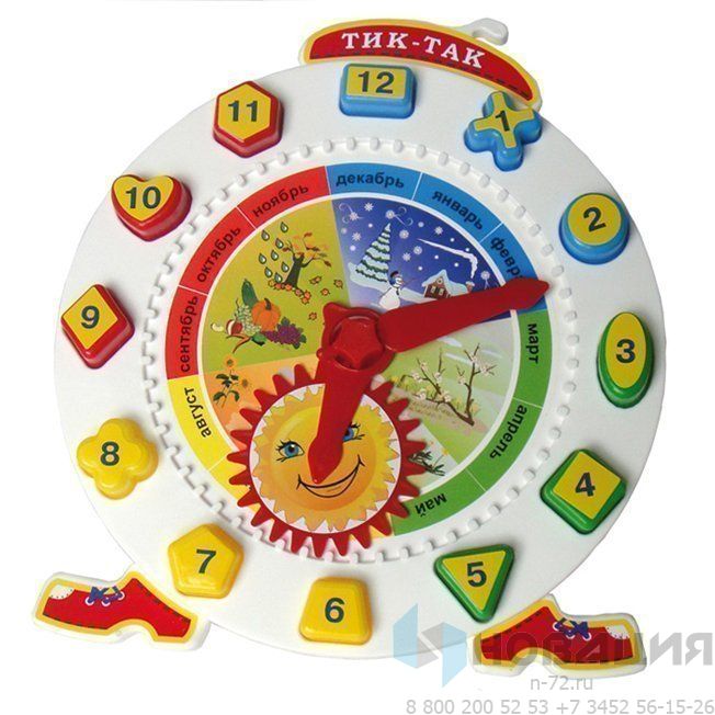 Цветной циферблат для детского сада оснащен фигурными элементами с изображениями чисел и шкалой с обозначениями времен года, названиями месяцев. Пластмассовые стрелки часов свободно вращаются во время познавательных занятий. Фигурные элементы легко вынимаются и вставляются обратно, что позволяет использовать игрушку как сортер.