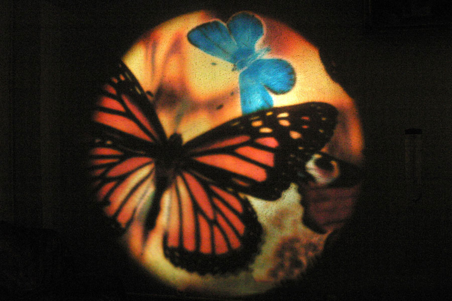 Источник света – галогенная лампа (100 Вт) со светоотдачей, которой хватает, чтобы проецировать слайды и вращающиеся колеса.
