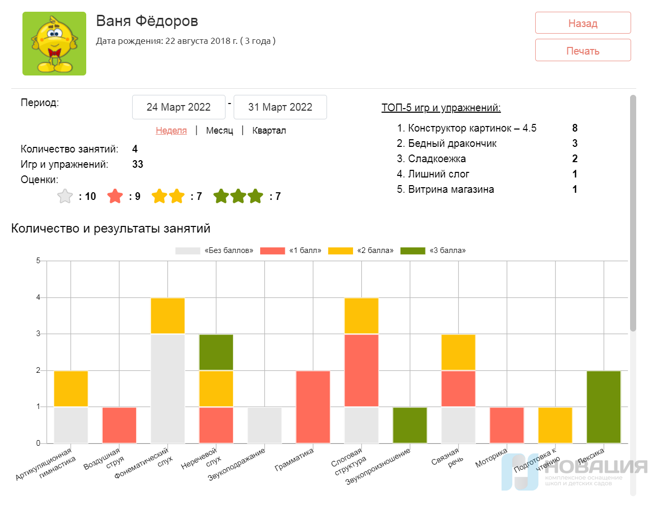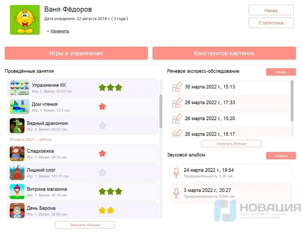 Звуковой альбом содержит записи речи ребенка и позволяет проанализировать ошибки, выявить слабые места и отследить прогресс.