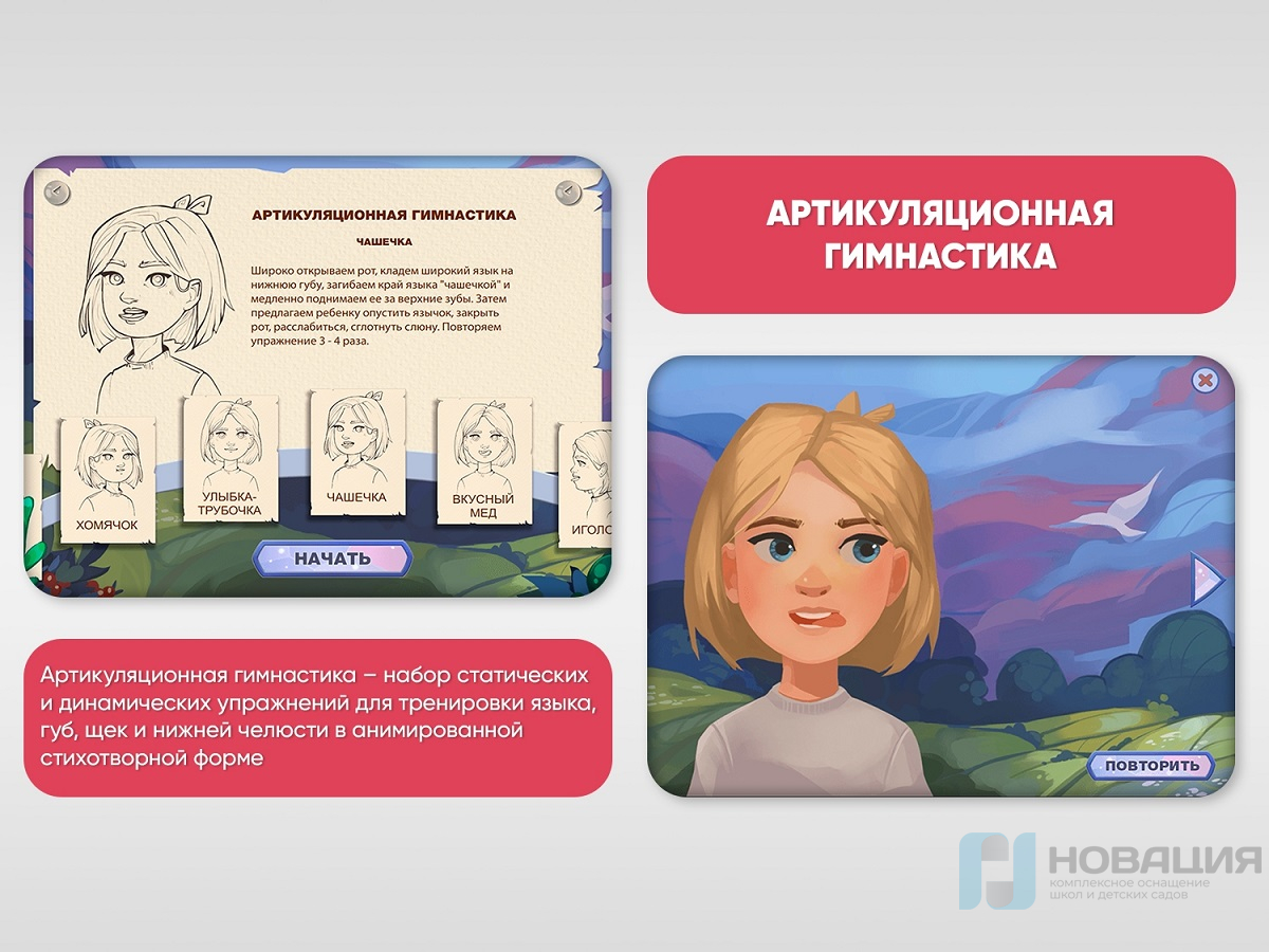 В блок артикуляционной гимнастики включены статические и динамические упражнений для тренировки языка, губ, щек и нижней челюсти в анимированной стихотворной форме.