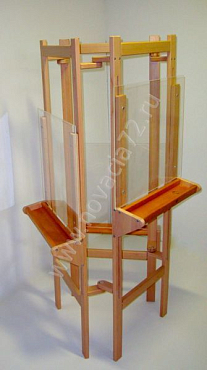 Прозрачный мольберт состоит из 4 частей. Каждое рабочее место оснащено полкой для кистей и красок. Готовую работу можно сохранить на бумаге. Для этого нужно приложить к свежему рисунку лист ватмана. Если рисунок успел немного подсохнуть, можно сначала слегка увлажнить его, а затем приложить бумагу.