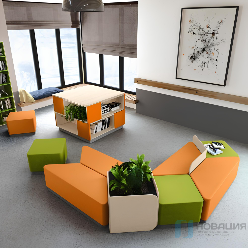 Мягкий пуф размещается в школах, библиотеках, коридорах и холлах университетов. Имеет форму трапеции, благодаря чему вписывается в современный интерьер помещения (даже с небольшой площадью свободного пространства). Используется как самостоятельный предмет мебели, но оригинальная форма позволяет сочетаться с другими фигурными моделями (пуфами, креслами и столиками), дополняя геометрическую композицию.