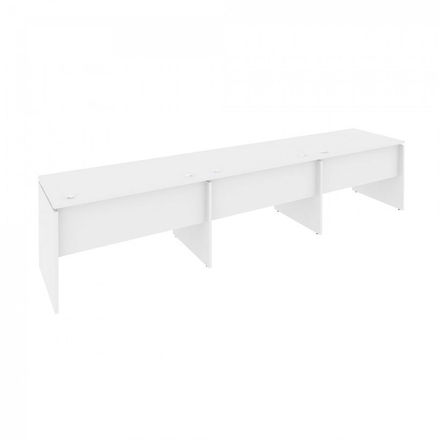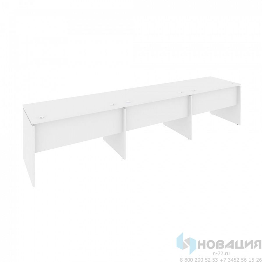 Рабочая станция представлена 3-мя последовательно расположенными столешницами на П-образном каркасе. Мебельный комплекс подходит для групповой работы и совещаний. Пластиковые элементы на опорах с винтами регулируются под неровности пола. Офисная мебель усиливается царгой. Детали из ЛДСП отделаны кромками толщиной 0,4 мм и 2 мм.