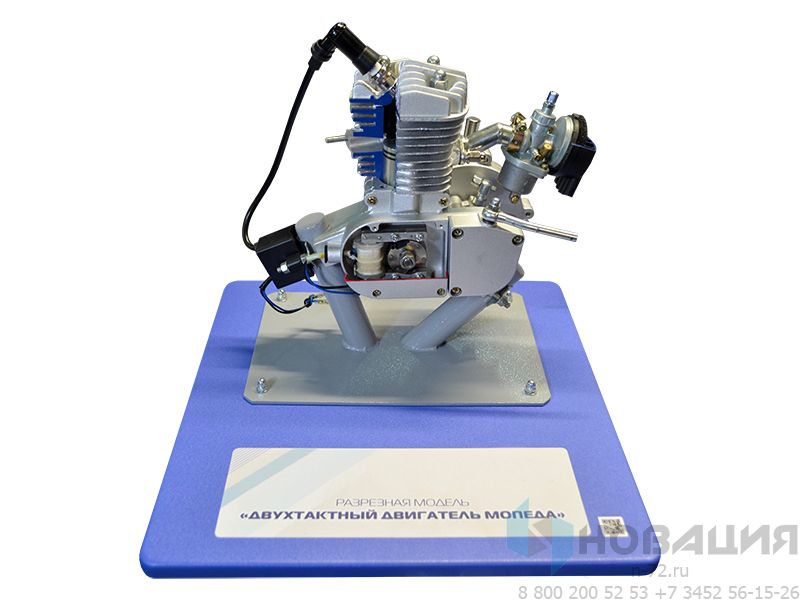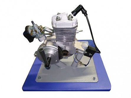 Макет позволяет изучить действие агрегатов и основных узлов двигателя внутреннего сгорания. На стенде представлен бензиновый 2-тактный двигатель в разрезе. Закреплены: блок цилиндра, головка цилиндра, картер, карбюратор, система зажигания, трансмиссии, воздушный фильтр.
