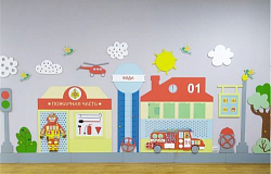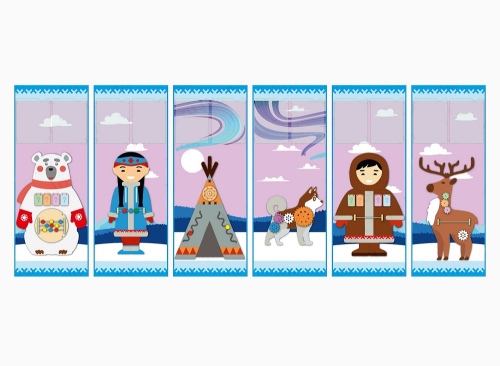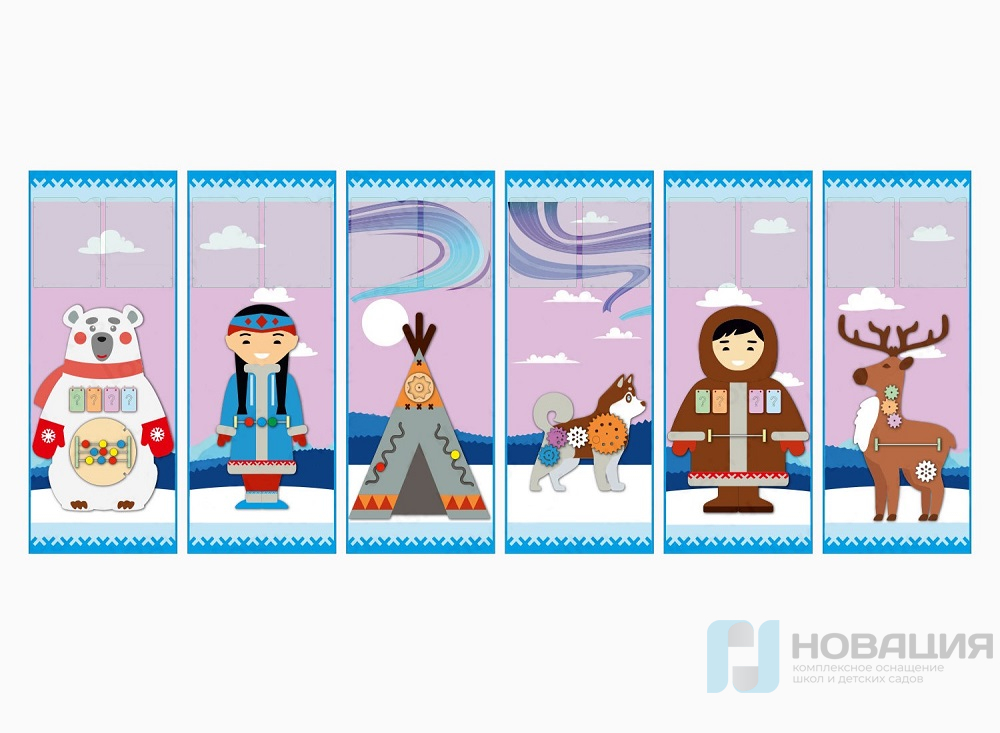 Композиция состоит из шести панелей с изображением символики Севера, людей в традиционных костюмах. На каждой панели есть два кармана формата А4, которые можно использовать для размещения информации.