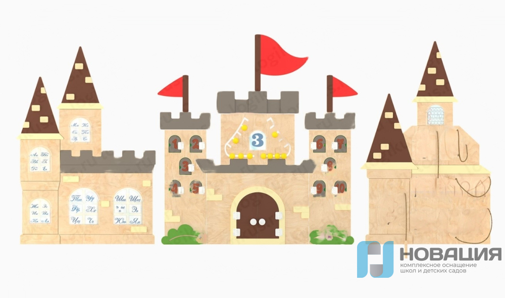 Настенная панель выполнена в виде замка. Изготовлена из гипоаллергенных материалов. На поверхности расположены окошки с цифрами и буквами русского алфавита.