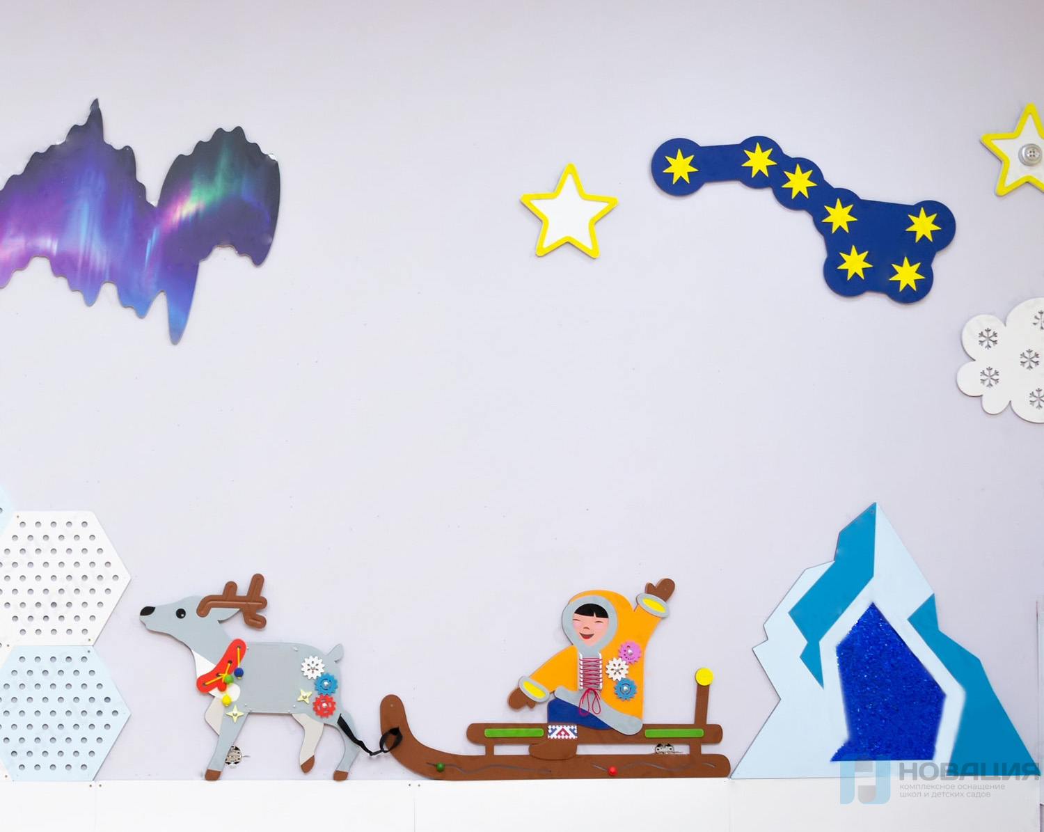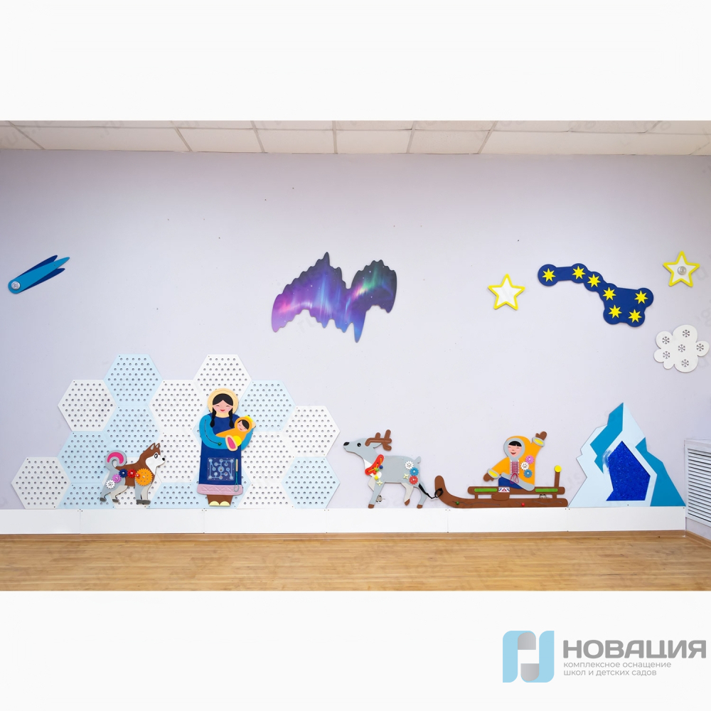 Панель выполнена в тематике традиций и быта народов крайнего Севера. Элементы крепятся по отдельности и свободно комбинируются между собой. На панели есть развивающие элементы: бегунки, шестеренки, лабиринты.