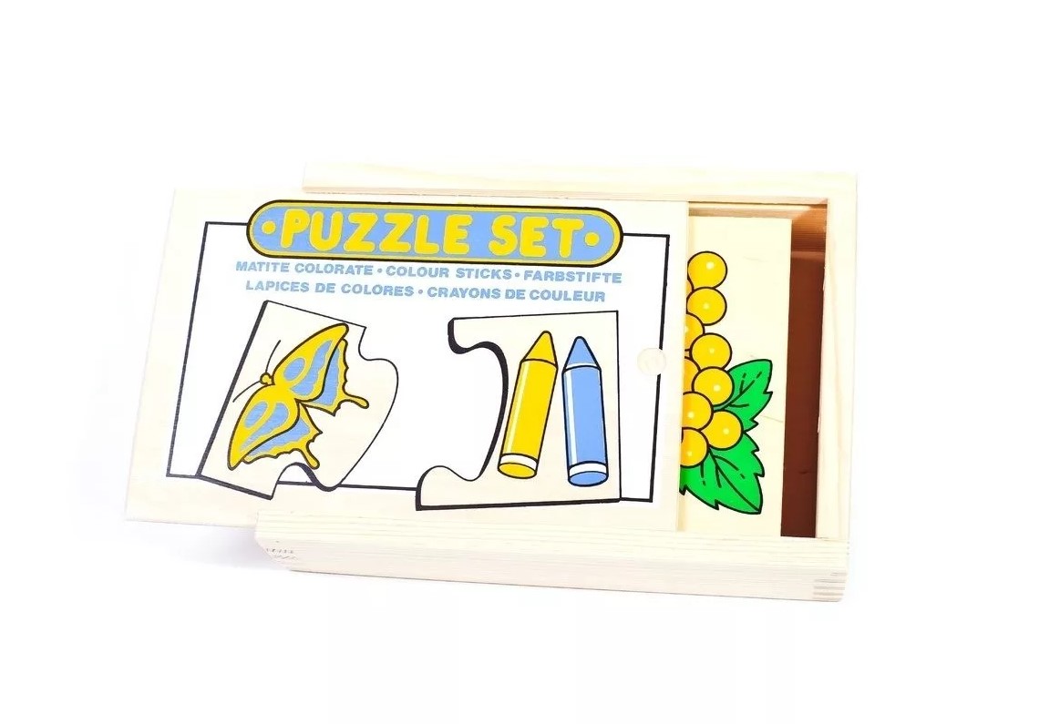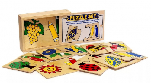 Пособие научит различать и запоминать цвета. Половинки панелей соединяются по принципу пазлов. Нужно подобрать к каждой картинке (с деревом, бабочкой, солнышком и др.) изображения карандашей, которые могли быть использованы для рисунка. Например, правильным сочетанием считается: божья коровка, красный и черный карандаши.