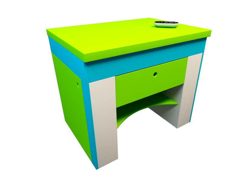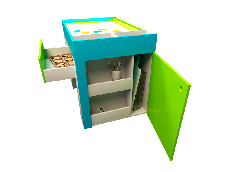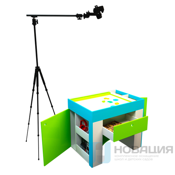 Веб-камера на штативе устанавливается над специальным столом с выдвижными ящиками и дверцами. Природные материалы, краски, инструменты и фигурки хранятся внутри. Верхняя поверхность огорожена бортиками, служит рабочем полем. Предусмотрены прямоугольные отделения для принадлежностей.