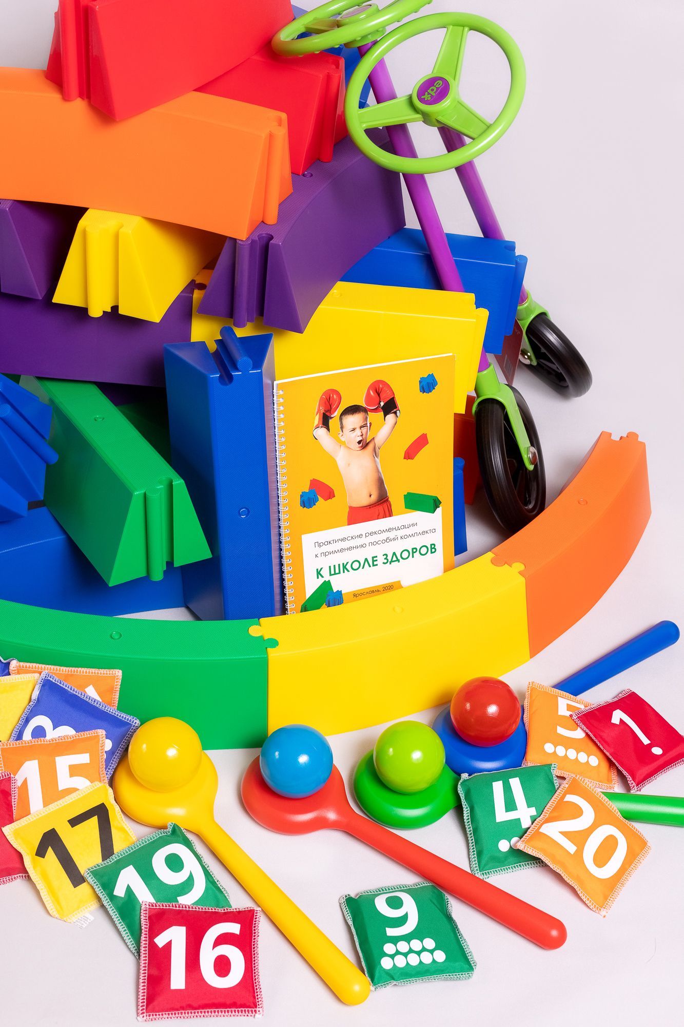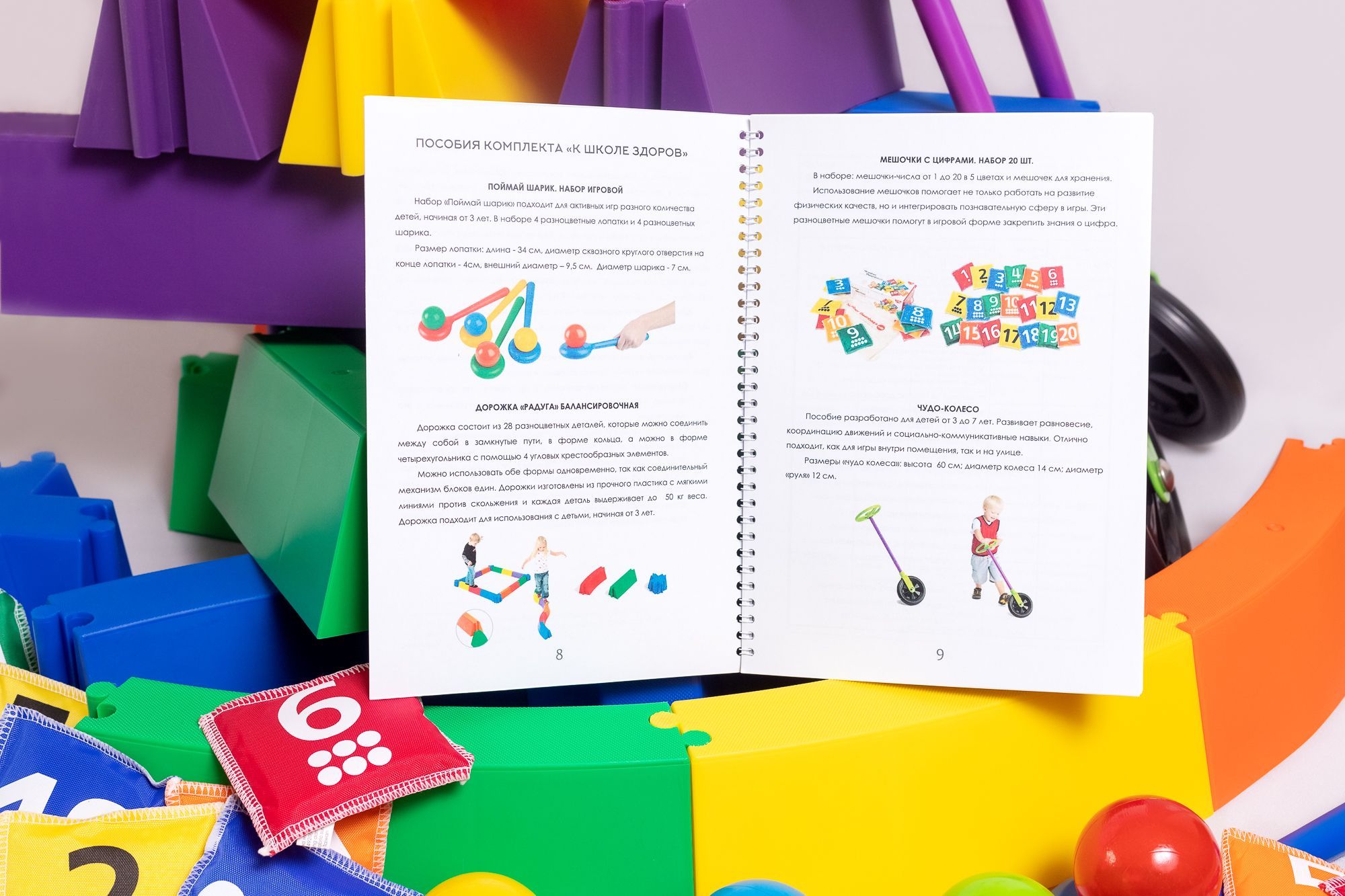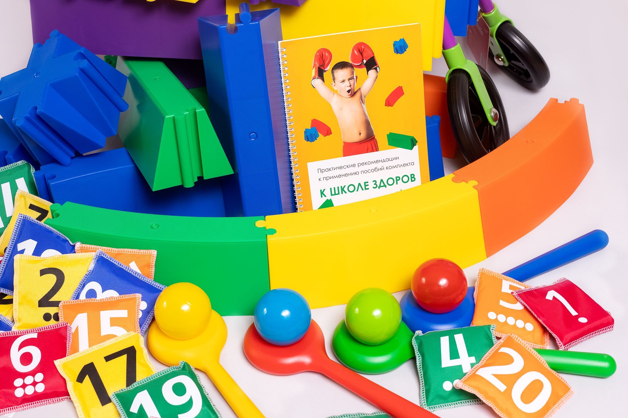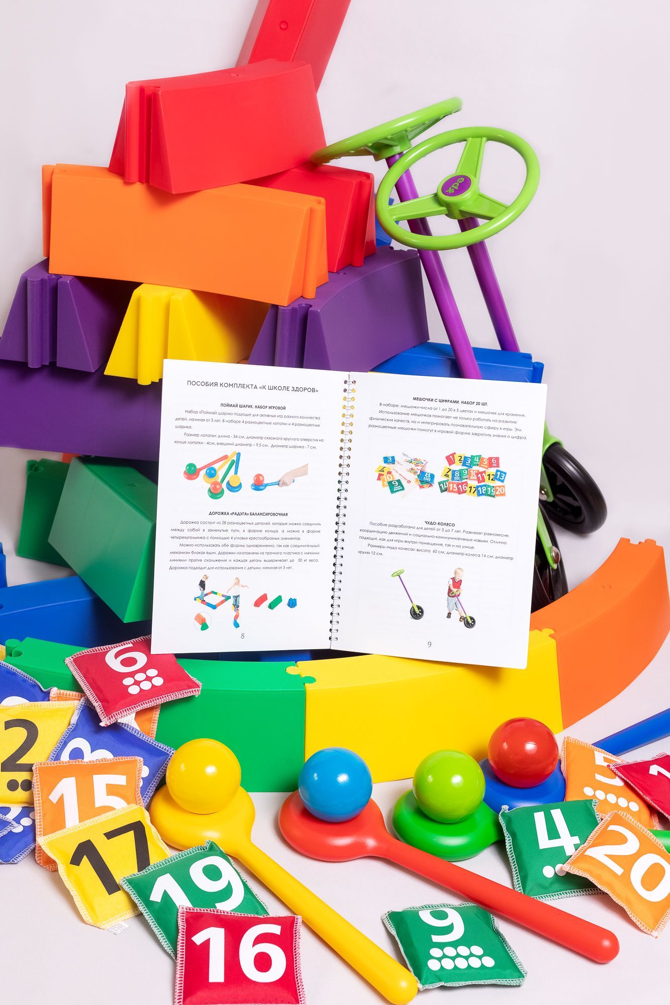 Элементы представлены в 5-ти цветах. На поверхности мешочков наносятся изображения цифр от 1 до 20. Занятия с набором обучают счету, стимулируют мышление и цветоразличение, развивают память.