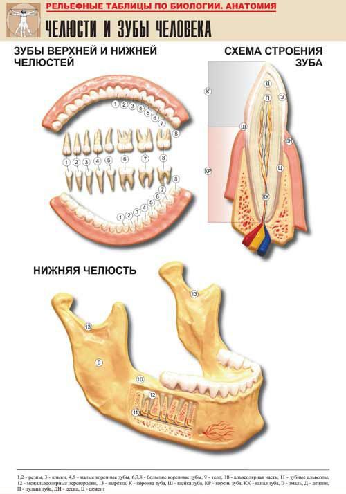 На белом фоне представлено расположение верхней и нижней челюстей человека, строение зуба и нижней челюсти. Элементы цветной схемы сопровождаются поясняющей информацией. Плакат для кабинета биологии (анатомии) покрыт антибликовой матовой пленкой с объемным эффектом. Благодаря специальной полноцветной печати таблица выглядит рельефной.