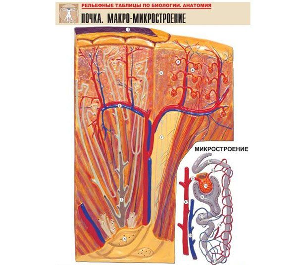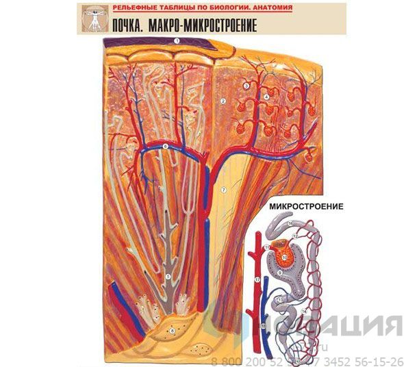На белом фоне схематически изображено микро- и макростроение человеческой почки. Элементы рисунка выделены разными цветами, сопровождаются поясняющей информацией. Таблица для уроков биологии (анатомии) покрыта матовой пленкой с объемным эффектом, исключающим блики. Благодаря полноцветной печати рисунок выглядит рельефным.