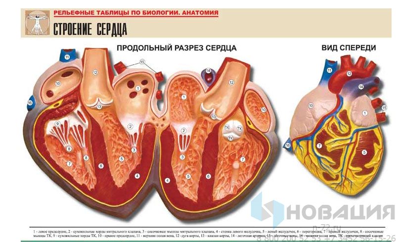 Строение сердца человека представлено в цвете, на белом фоне, с объемным эффектом. Элементы таблицы сопровождаются поясняющей информацией. Плакат для кабинета биологии (анатомии) ламинируется матовой пленкой без бликов.