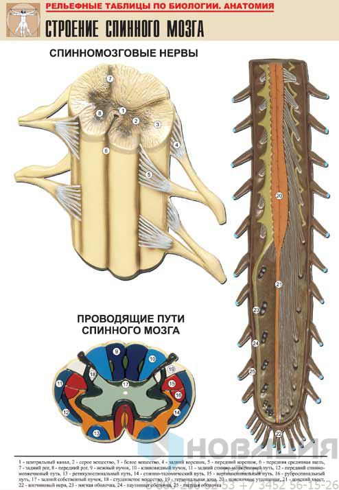 На белом фоне показано строение спинного мозга человека (с проводящими путями и нервами на отдельных фрагментах). Элементы рисунка обозначаются разными цветами, сопровождаются поясняющей информацией. Таблица для уроков биологии (анатомии) покрыта матовой пленкой с объемным эффектом, исключающим блики. Рисунок с полноцветной печатью выглядит рельефным.