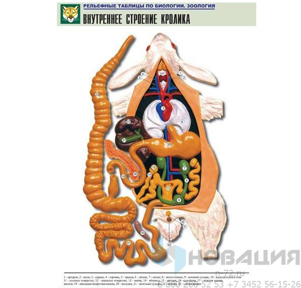 На белом фоне представлен организм кролика в продольном разрезе, показано расположение внутренних органов. Элементы схемы сопровождаются поясняющей информацией. Благодаря специальной полноцветной печати таблица выглядит рельефной. Плакат для кабинета биологии (зоологии) покрыт матовой пленкой с объемным эффектом, исключающим блики.