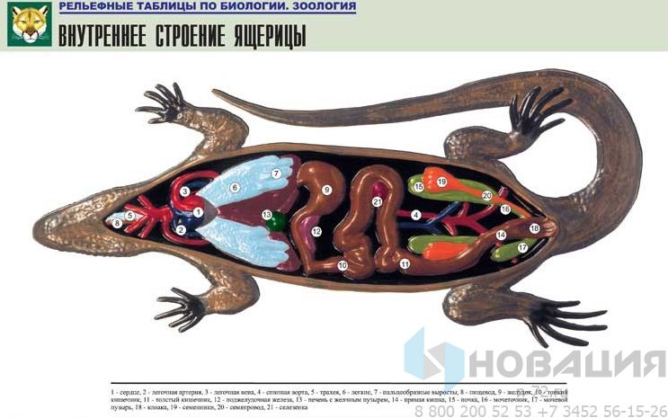 Таблица для уроков биологии (зоологии) покрыта матовой пленкой с антибликовым эффектом. На белом фоне схематически изображено тело ящерицы и показано строение внутренних органов. Элементы выделены разными цветами, сопровождаются нумерацией и надписями. Благодаря специальной полноцветной печати рисунок выглядит рельефным.