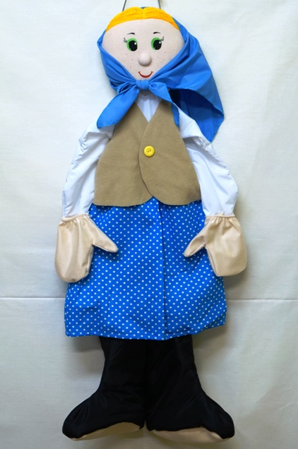 Ростовая кукла быстро надевается: регулируемая тесьма фиксируется на шее, варежки и рукава на резинках растягиваются. Ноги ребенка вставляются в валенки.