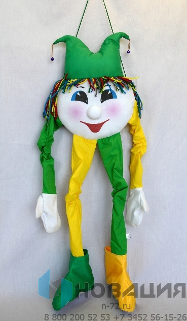 Ростовая игрушка представлена в виде сказочного персонажа в колпаке с бубенчиками. Мягкая кукла подходит для театральных спектаклей, праздников, логопедических занятий в ДОУ.
