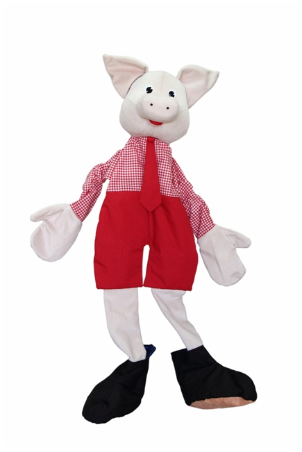 Ростовая кукла фиксируется на шее, ноги ребенка вставляются в штанины и валенки. Рукава с варежками растягиваются на резинках.