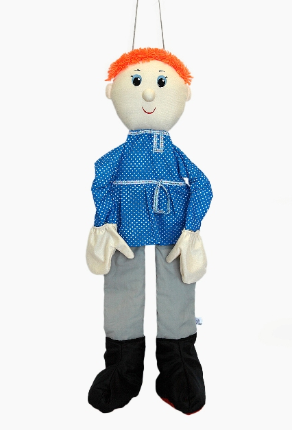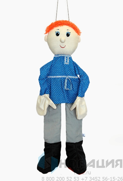 Универсальная ростовая кукла легко надевается: регулируемая тесьма фиксируется на шее; ноги ребенка вставляются в валенки; варежки и рукава на резинках растягиваются.