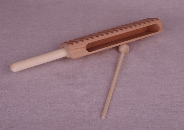 Изделие поставляется в комплекте с палочкой для игры. Ребристая поверхность колотушки с ручкой подходит для извлечения звуков. Музыкальный инструмент учит дошкольников и младших школьников воспроизводить мелодию посредством постукивания, тренирует память и координацию движений, помогает развить чувство ритма.
