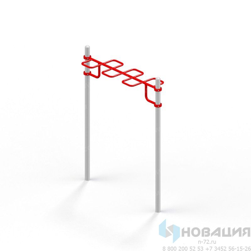 Конструкция включает в себя 2 опорные стойки и поперечную перекладину в виде извилистой металлической трубы, которая фиксируется на поверхности каждой стойки в 2-х местах. Сварные швы сглажены, чтобы ребенок не поранился при выполнении упражнений.