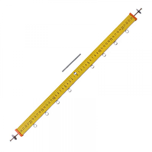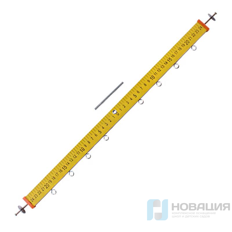 Шкала оцифрована, сопровождается крючками для грузов. По центру предусмотрена втулка для оси. Торцы изделия оснащены винтами на балансировочных гайках.