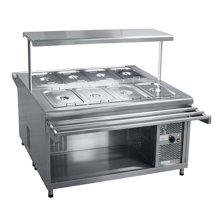 Охлаждаемый салат-бар рассчитан на 8 гастроемкостей. Устанавливается на линии раздачи в столовой школы, ДОУ, иного муниципального учреждения. Имеет 1 полку с лампой подсветки.