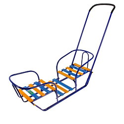 Детские санки для катания на свежем воздухе выдерживают нагрузку до 25 кг. Ребенок едет в положении сидя. Конструкция оборудована изогнутыми полозьями, удобной спинкой и подлокотниками. Сиденье для 1-го человека составляется из прочных отшлифованных реек, окрашенных в разные цвета.