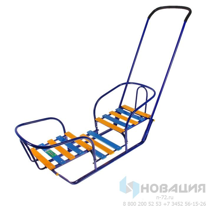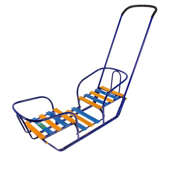 Санки со съемной ручкой и широкими полозьями подходят для одновременного катания 2-х детей. Сиденья из разноцветных реек (290х320 мм каждое) расположены лицом друг к другу. Предусмотрены подставки для ног. Конструкция выдерживает нагрузку до 35 кг. Плоские полозья (300 мм) легко скользят по снегу.