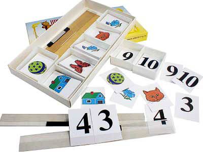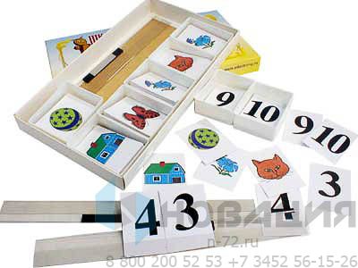 Учебное пособие представляет собой набор карточек с цифрами от 1 до 10 и пяти видов фигурок разного цвета.