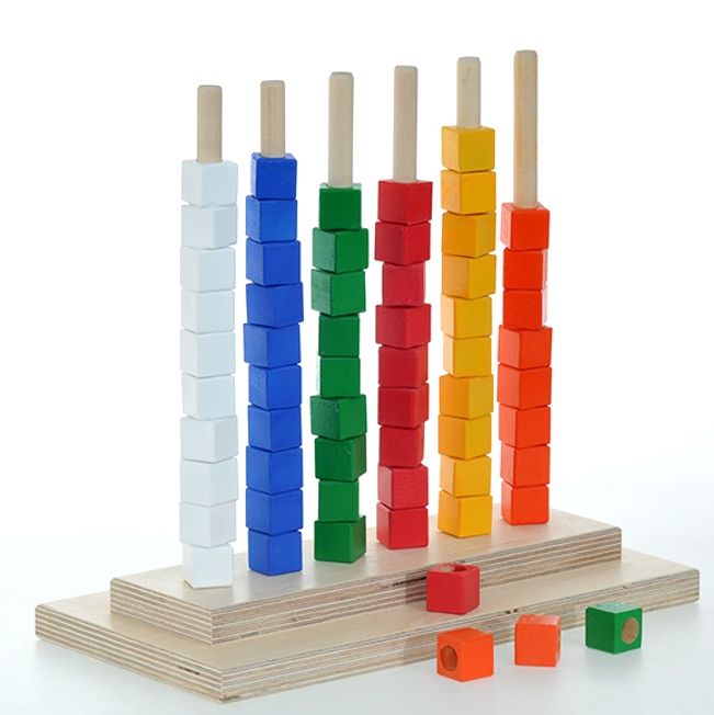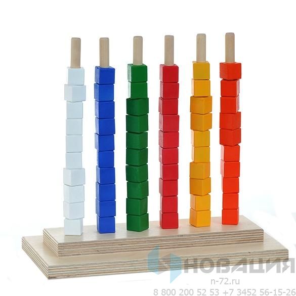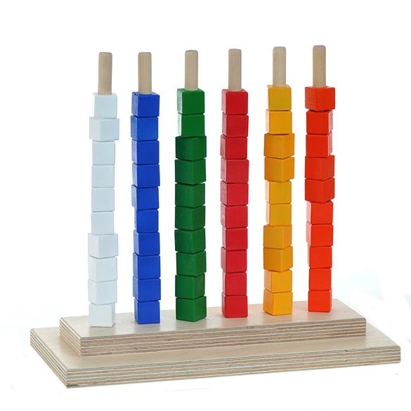 6 стержней на двойной подставке служат основой для детской игры. Яркие кубики с отверстиями в центре нанизываются на ось. Можно сортировать их по цветам, чередовать, выполнять арифметические операции: складывать и отнимать.