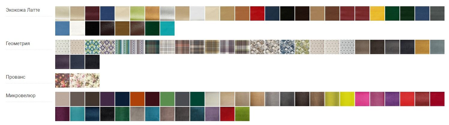 Возможно исполнение с обивкой из экокожи, микровелюра, ткани с геометрическими рисунками, ткань прованс (стоимость в таком случае изменится).