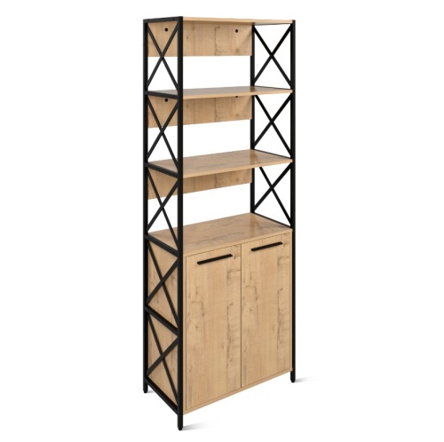 Шкаф состоит из металлических стоек, полок и закрытой секции с двумя дверьми, в которй есть полка, регулируемая по высоте с шагом 32 мм. Для плавного предусмотрены мебельные петли с доводчиком. Каркас закреплен на стойках из металлических опор с иксобразными элементами.