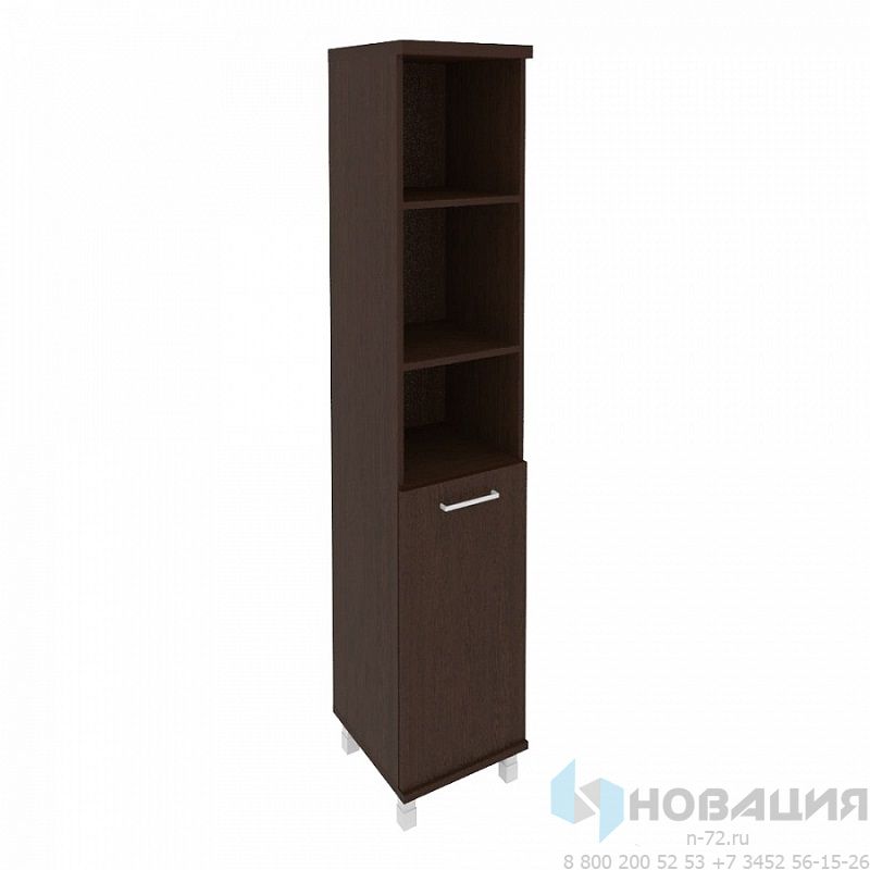 В узком стеллаже 3 полуоткрытых отделения и низкий фасад с распашной дверцей. ЛДСП отделана кромкой (0,4 и 2 мм) в цвет мебели. Шкаф стоит на высоких регулируемых опорах из металла. Створка оснащается фурнитурой для открывания направо или налево.