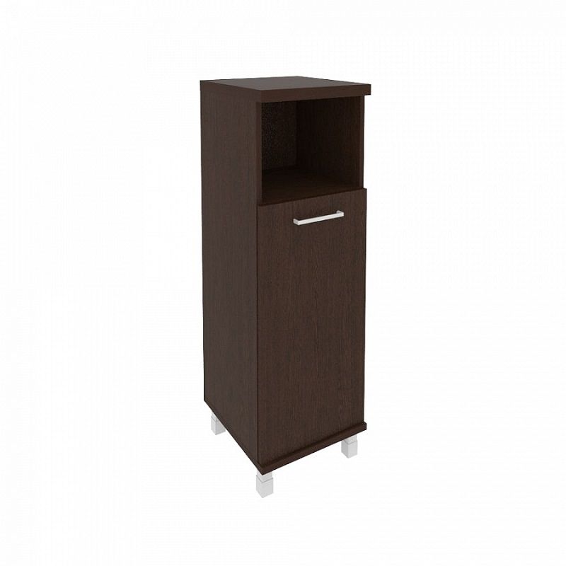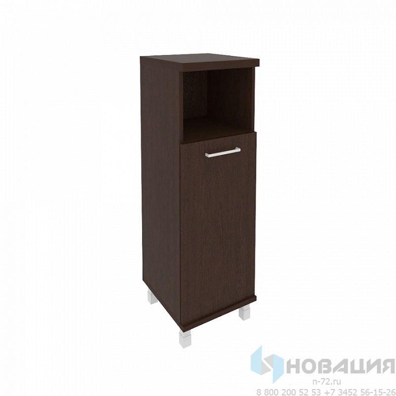Стеллаж средних размеров оснащается вместительной нишей и глухим фасадом с 1-створчатой дверцей. Створка из ЛДСП открывается направо или налево, дополняется фурнитурой. Шкаф для бумаг стоит на высоких регулируемых опорах из металла. ЛДСП отделана кромкой (0,4 и 2 мм) в цвет мебели.